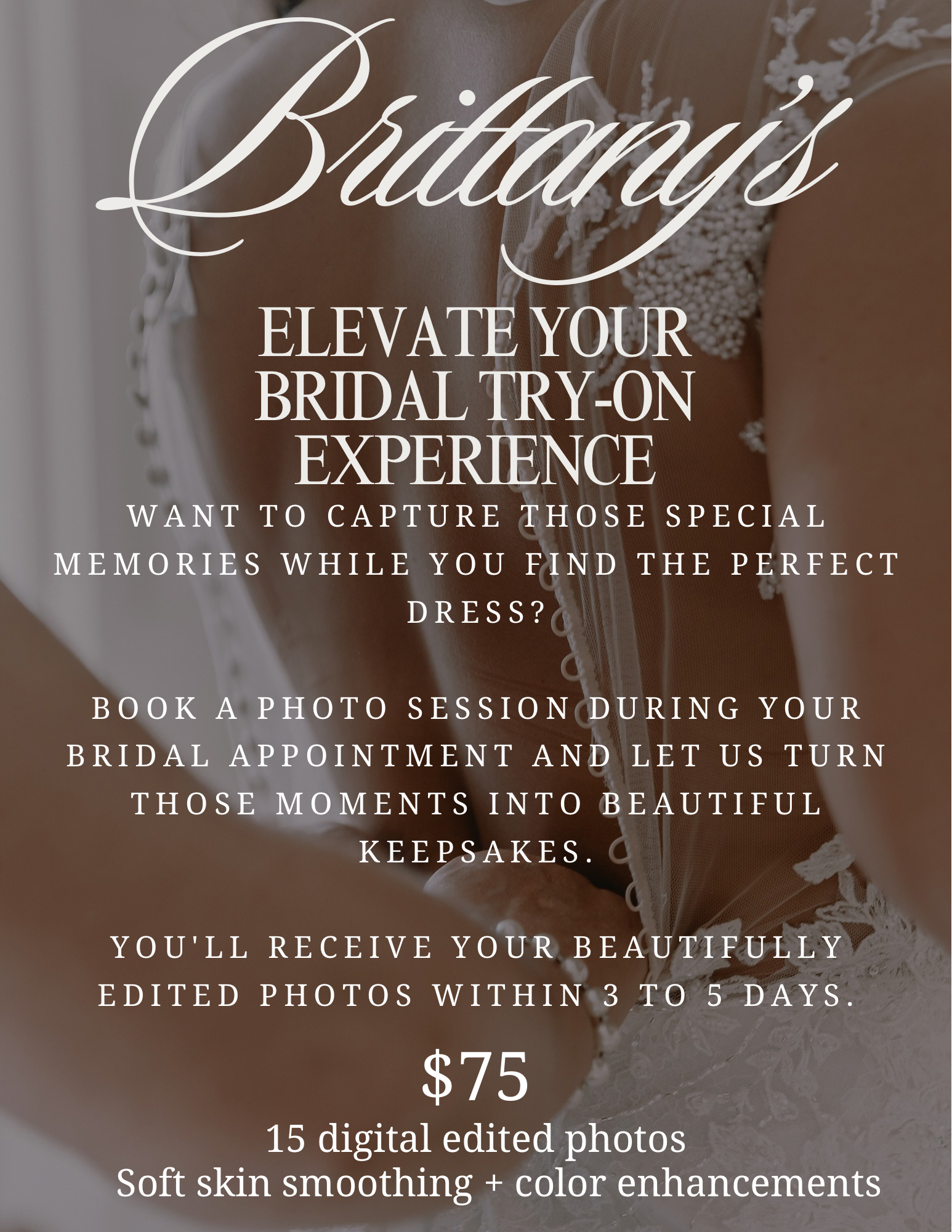 Capture the magic of your "yes" mount with our exclusive Bridal Consultation Photo Session. This add-on includes a beautifully styled mini photoshoot during your appointment, going you professional, high-quality images of you trying on gowns, special reactions, and candid moments with your loved ones.